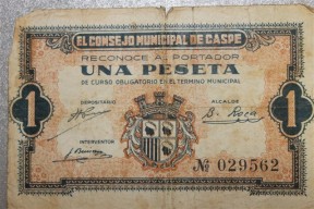 La «peseta caspolina» es la mejor conocida de esta terna de billetes locales que, según creemos (el tema de la moneda de guerra en nuestra comarca todavía no ha sido abordado en ningún estudio monográfico), se emitieron únicamente entre febrero y agosto del año 1937. No en vano, Benito Roca -quien firma los billetes- fue presidente del Consejo Municipal entre febrero y agosto de ese año (antes fue presidente del Comité Revolucionario) y, hasta el momento, todos los billetes que han aparecido pertenecen a ese periodo.